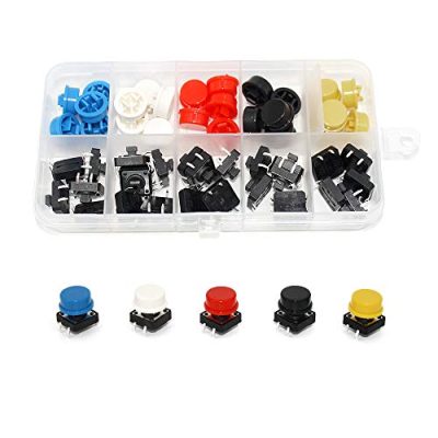 The WOWOONE 25pcs 12x12x7.3 mm Tact Tactile Push Button Switch is a high-quality switch designed with a high precision mechanism. Its buttons have a lifespan of up to 40,000 times in a 12V DC environment. These subminiature pushbutton switches are perfect for DIY electronic enthusiast products and can be used for a variety of applications including electronic product buttons, printer buttons, phone buttons, and computer display buttons. The assortment kit comes with 25 push buttons in different colors, allowing you to easily distinguish between them. The buttons are packed in a high-quality box for easy organization. Turn your creative ideas into reality with this versatile switch kit.