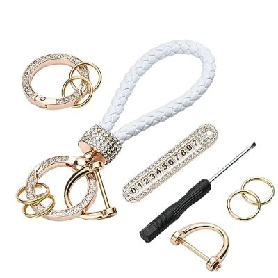 The MUGVOLAX Anti-Lost car Keychains are stylish and functional accessories designed to keep your keys secure and easily accessible. Made of high-quality materials, the keychain features a leather woven design and bling rhinestones for an attractive look. It comes with a phone number plate that allows you to attach your contact information, ensuring that your keys can be returned to you if lost. The keychain also has multiple hooks for hanging badges, keys, and other small tools. With its fashionable design and versatile functionality, this keychain is a must-have accessory. Its white color and standard size make it suitable for anyone. Customers have rated it 4.5 out of 5, praising its cute design and durability. If you're looking for a stylish and practical keychain, this product is worth considering.
