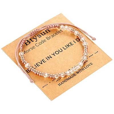 The Btysun Inspirational Bracelets for Women are a perfect way to express belief and trust in oneself. These beautiful bracelets are designed with a secret message in Morse code, encouraging women to believe in themselves just like the person who gifts it. The braided bracelets are adjustable and easy to put on and off, making them suitable as inspirational gifts. Made with rose gold and clear crystal beads, these bracelets are not only stylish but also comfortable and durable to wear. They come with a delicate card and box, making them a thoughtful gesture for birthdays, anniversaries, Christmas, or Thanksgiving. The Btysun Inspirational Bracelets for Women are the perfect way to show love and support to a special woman in your life.