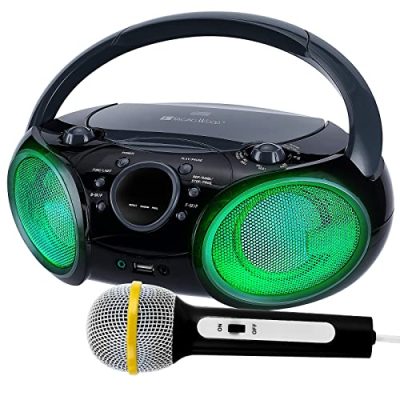 The SingingWood NP030AB-GK Portable Karaoke System is a versatile and portable CD player boombox with Bluetooth capabilities. It features a multi-function design, allowing you to play your music from various sources such as CDs, Bluetooth-connected devices, and USB dongles. The boombox also includes a microphone, allowing you to sing along to your favorite songs. With its color-changing LED dance lights, you can enjoy a visual entertainment experience that synchronizes with the rhythm of the music. The boombox is powered by either AC or batteries, making it convenient for both indoor and outdoor use. Overall, the SingingWood NP030AB-GK Portable Karaoke System offers clear and powerful sound, making it a great choice for music lovers and karaoke enthusiasts.