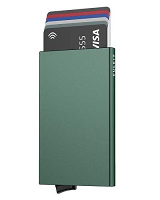 The VULKIT Pop Up Wallet is a slim and minimalist credit card holder designed for both men and women. With its patented slider mechanism, you can quickly and easily access your cards. It can hold up to 5 cards of credit card size and rigidity, and features RFID and NFC blocking to protect your cards from unwanted wireless communication. The wallet is made of lightweight aluminum and has a pocket-sized design, making it ultra-slim and easy to carry. It also has a patented double silicone strip to keep your cards securely held inside. The wallet comes in a stylish midnight green color and has dimensions of 0.39Lx2.36Wx3.94H.