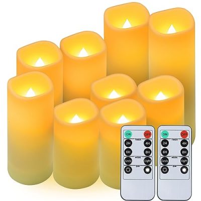 Create the perfect ambiance with the Vinkor Flameless Candles. This set of 9 ivory-colored candles features realistic flickering flames for a cozy and safe candlelit experience. Operated by batteries, these flameless candles come with a 10-key remote control for easy and convenient use. The timer function allows you to automatically turn the candles on and off, cycling every 24 hours. Made of real wax, these candles are perfect for decorating any occasion from birthdays to weddings. With their lifelike flame effect, they bring a touch of elegance to any room. Enjoy the beauty of candlelight without worrying about fire hazards or burning risks.