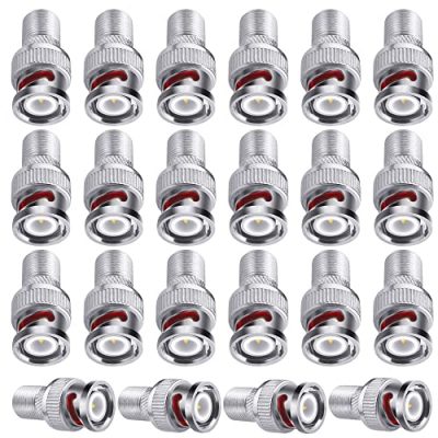 The F to BNC Connector is a set of 22 BNC Male Plug to F Female Jack Coax Adapters. These connectors ensure higher signal transmission and minimal signal loss with an impedance of 75 Ohm. The connectors are precisely made, threaded cleanly, and securely latched on, preventing them from falling off during use. They serve as a quick solution to check, extend, adapt, or convert connector types for devices requiring a BNC or F connection. These adapters are perfect for RG6 RG59 coaxial cables and can be used with satellite, TV, scanner, security camera, tester, DVR, and more. The package includes 22 pieces of 75Ohm F Female to BNC Male coax adapters.