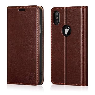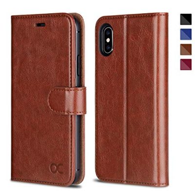 OCASE iPhone X/10 Wallet Case - Wireless Charging, Card Slot, Kickstand, Leather Flip Cover - Brown