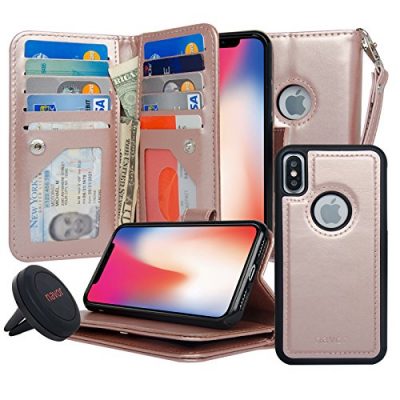 - I Phone X wallet case – WALLET FEATURES – Includes essential slots for your photos, cards, and cash! 3 card slots + 1 cash slot and a strong magnetic closure clip for extra security and hold.