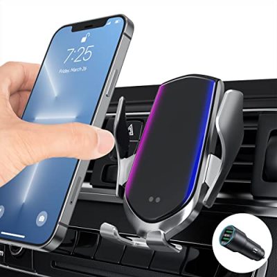 The GTIMLMC Wireless Car Charger Vent Mount is a versatile and convenient phone holder that also offers fast wireless charging for all Qi-enabled Apple and Android smartphones. It is compatible with a wide range of iPhone and Samsung Galaxy models, as well as other popular brands. The holder features easy one-hand operation, with an automatic clamping system and a single button release. It can be securely mounted on most air vents, allowing for adjustable viewing angles. The charger is compatible with most phone cases and offers fast and safe charging with multiple protections. The package includes the wireless car charger holder, a car charger adapter, an air vent clip, a Type-C cable, and a user manual. With its excellent features and reliable performance, this car charger vent mount is a great addition to any vehicle.