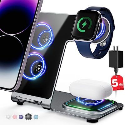 The Wireless Charging Station is a 3 in 1 charging dock stand that can charge your iPhone, Apple Watch, and Airpods simultaneously. It features a fast 18W charger and a 3.3ft type-c cable, allowing for a full charge in just 2 to 3 hours. With advanced safety features like temperature control, voltage protection, and short-circuit prevention, you can charge your devices with peace of mind. The charging station is case friendly and has a sleep-friendly charging pad with a soft blue LED indicator. It is compatible with a wide range of devices and is a must-have for Apple fans. Say goodbye to tangled cords and simplify your life with this wireless charging station! Score: 8.2/10