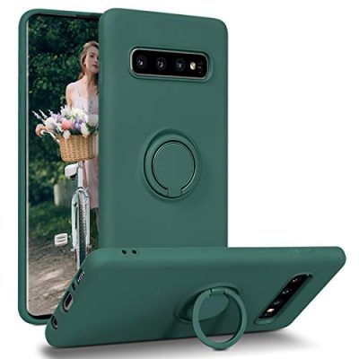 Protect your Samsung Galaxy S10 with the DUEDUE Liquid Silicone Case. This slim and soft gel rubber cover offers shock absorption and full protection against scratches. It features a built-in ring kickstand for hands-free viewing and a metal plate for magnetic car mount compatibility. With raised bezels and complete corner coverage, this case provides enhanced screen and camera protection. The high-grade silicone material is smooth, anti-fingerprint, and environmentally friendly. The case is easy to clean and offers easy access to all phone functions and buttons. Available in a stylish pine green color, it adds a touch of elegance to your device. Overall, this case offers great protection and convenient features for your Samsung Galaxy S10.