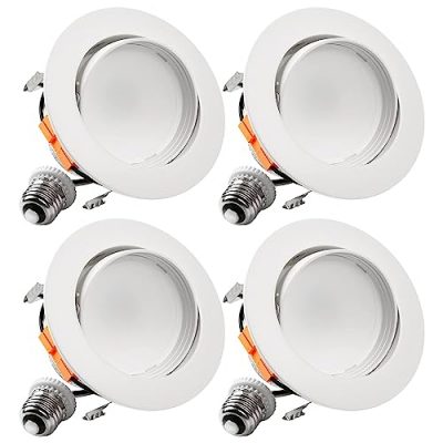 Elevate your home's aesthetics with TORCHSTAR high-quality LED recessed lights. The rotatable design allows for customizable lighting options and dimming. The high CRI of 90+ displays objects vividly under the warm yellow light. Seamless dimming from 10% to 100% creates different brightness levels. The 4 inch gimbal LED recessed lights are durable with excellent heat dissipation and a longer lifespan. This energy-efficient light will save you up to $847 over its lifespan. It is compatible with most LED dimmers on the market and is UL and Energy Star listed. The pack of 4 lights comes with a 3-year warranty. Perfect for bedrooms, kitchens, and living rooms.