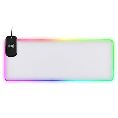 The White Wireless Charging RGB Gaming Mouse Pad is a must-have accessory for gaming enthusiasts. This mouse pad combines functionality with style, offering a wireless charging feature and a sleek design. It comes with a 15W Qi wireless charging capability that supports fast charging for various phone models. The high-quality non-slip material ensures a firm grip on the desk, preventing any movement during intense gaming sessions. With its extra-large size of 35.4 x 15.7 inches, it provides ample space to cover the keyboard and mouse, protecting your desk from scratches. The 14 customizable RGB lighting modes create a unique gaming atmosphere, and the memory function saves your last light mode choice. Compatible with all keyboards and mice, this mouse pad offers superior control and precise mouse movements. Upgrade your gaming setup with this feature-packed mouse pad.