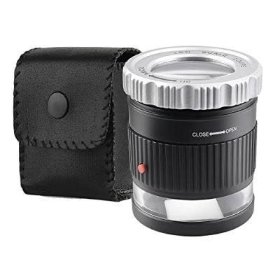 The 30X Loupe Magnifier is a versatile and compact magnifying glass that offers adjustable focal length for various applications. Made of high-quality ABS plastic material, it is durable and lightweight, making it suitable for on-the-go use. With its adjustable focal length, you can easily view objects with clarity and even measure their size. The magnifier features both white lights for regular observations and UV lights for money detection. It also comes with a soft leather case for convenient storage and protection. Ideal for a wide range of purposes such as printing, handcrafts, watch repairs, and coin or jewelry examination, this magnifier is a handy tool to have. However, some users have mentioned difficulties with turning off the UV light and replacing the battery.