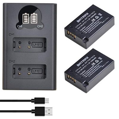 The Batmax 2Packs LP-E17 Battery + LED Charger is a high-quality battery and charger set designed for Canon EOS Rebel SL2 SL3 T6i T6s T7i, EOS M5 M3 M6, M6 mark2, 77D 200D 250D 750D 760D 800D 8000D RP Digital SLR Cameras. With a capacity of 1040mAh, these batteries provide longer battery life with no memory effect. They are CE certified and have been tested by the manufacturer to match OEM products. The package includes 2 compact LP-E17 batteries, a USB LED dual charger, a USB micro cable, and a manual. With a 30-day money-back guarantee and a two-year warranty, this battery and charger set is a reliable choice for photographers.