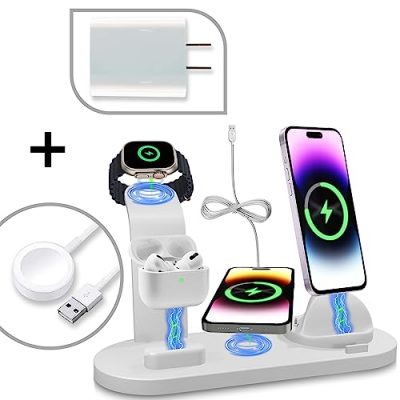 The Apple Wireless Charger 4 in 1 Magnetic Wireless Charging Station is a versatile and efficient charging station designed to charge your iPhone 14/14 Plus/13/12/11 Pro/Pro Max, AirPods 3/2/1, Pro 2/1, and Apple Watch Ultra 8 7 6 SE 5 4 3. It features fast and stable wireless charging with upgraded double coil design and built-in safeguards to protect your devices. The charger also has a sleek and high-quality appearance with non-slip designs and can be used as a cell phone holder. It comes with a 1-year replacement warranty and lifetime customer service. Please note that the phone case must be less than 4mm and metal cases are not supported.