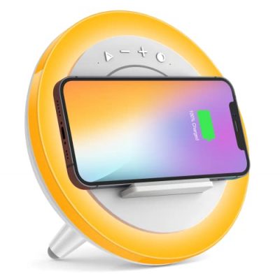 The SIDVAR Wireless Charging Bluetooth Speaker is a versatile 4-in-1 device that functions as a Bluetooth speaker, night light, wireless charging station, and phone holder. It features intuitive controls for volume, play/skip songs, answer calls, and switch light modes, making it a convenient and multifunctional addition to any room. The Bluetooth 5.0 connectivity ensures stable and instant pairing with a wireless range of up to 33 feet. With its adjustable sound, user-friendly design, and toy-grade materials, this Bluetooth speaker is an excellent gift idea for birthdays, holidays, and special occasions. The SIDVAR Wireless Charging Bluetooth Speaker is available in a classic white color and offers a relaxing sleeping environment with its 7 solid colors and 2 dynamic lights. Note that using the original adapter is recommended for normal operation.