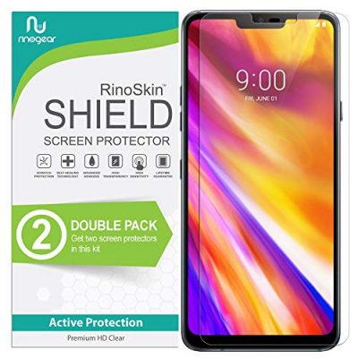 The RinoGear Screen Protector is designed to protect the LG G7 ThinQ (6.1-inch) screen. Made with flexible 'smart skin' film, it offers full coverage and preserves the touchscreen functionality. Although it requires a 'wet install', users have found it easy to apply and appreciate the invisible, high-definition clarity it provides. The package also includes a lifetime replacement film voucher. While some customers have experienced issues with residue and bubbling, overall, it offers good value for the price. The protector is compatible with most LG G7 ThinQ cases and comes with a 3.8/5 customer rating on Amazon.