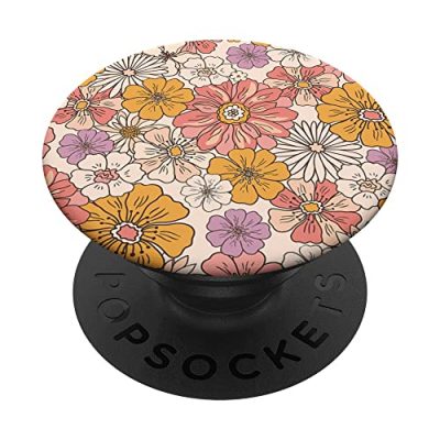 The Retro Flowers Meadow Floral Groovy 70s Peach Orange Pink PopSockets Swappable PopGrip is the perfect accessory for lovers of the 70s and hippie years. Featuring a cute aesthetic retro flowers pattern in trendy pink, peach, and orange colors, this PopSockets PopGrip adds a touch of botanical and garden romantic style. It is not only a fashionable accessory but also a functional one. With its expandable stand, you can easily watch videos, take group photos, FaceTime, and Skype handsfree. The PopGrip is designed with an advanced adhesive that allows for removal and repositioning on most devices and cases. However, note that it may not stick well to silicone, waterproof, or highly textured cases. Overall, this PopSockets PopGrip is a stylish and practical choice for spring and summer, making it an excellent gift for women, girls, moms, and grandmas.