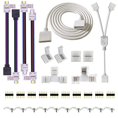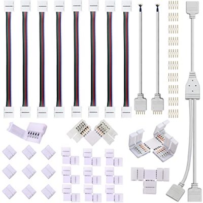 - Easy Installation —- This kit including 1x 2 way 5 Pin splitter cable, 8x strip to strip jump wires, 2x 5 Pin wires, 10x Pin connector, 10x Gapless connector, 10x L Shape corner connector, 2x T shape connector, all of them are solderless and easy installation.