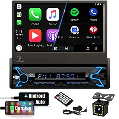 Upgrade your car audio experience with the (Motorized) Single Din Car Stereo. This car stereo is equipped with a 7-inch flip-out touchscreen that supports Apple Carplay and Android Auto, allowing you to access various smartphone functions hands-free via voice control. It also comes with a high-definition backup camera with a wide viewing angle to enhance your safety while reversing. The HD touch screen supports 1080P video playback and offers a mirror link function for easy display of mobile apps. Other features include Bluetooth connectivity, DSP for audio customization, and support for various audio formats and radio stations. With its electric telescopic function, this car stereo provides convenience and an improved driving experience. Compatible with most car models, it's the perfect gift for DIY vehicle enthusiasts.
