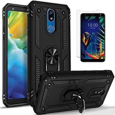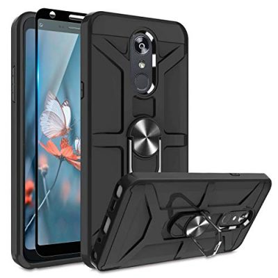 The TJS Phone Case Compatible with LG K40/K12 Plus/X4/Solo LTE/Harmony 3/Xpression Plus 2 is a durable and protective phone case with a full coverage tempered glass screen protector. It is perfect for LG K40, LG K12 Plus, LG X4 2019, LG Solo LTE, LG Harmony 3, and LG Xpression Plus 2. The case has a built-in metal plate, allowing it to be easily attracted to a magnetic car mount holder. It features dual layers of shockproof TPU and solid PC for double protection and has a 360-degree rotating ring holder that doubles as a kickstand for hands-free viewing. The case also includes responsive button covers, precise cutouts, and raised lip protection. The TJS Phone Case is available in black.