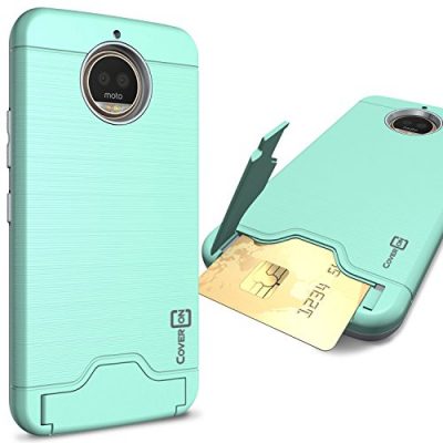 The CoverON Credit Card Holder Protective SecureCard Series is a mint teal case designed for the Motorola Moto G5S Plus. It features a card holder slot that securely stores cash or credit cards, as well as a fold-out kickstand for hands-free phone usage. The case has a modern look with a faux brushed metal design, adding a subtle and appealing appearance. It also offers heavy-duty phone protection with a dual-layer hybrid design. The inner layer is made of shockproof TPU, while the outer layer is rigid hard polycarbonate. This case comes in a mint color.