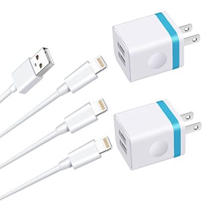 The iPhone Charger and Wall Plug is a must-have accessory for Apple users. This product includes a 2-pack of 6ft Lightning cables with a fast dual-port USB charging adapter block. The charger block features a dual USB multi-port output, allowing you to charge two devices simultaneously at high speed. It is not compatible with Qualcomm fast charge. The lightning cable is Apple MFi certified and comes with a built-in chip for automatic identification, ensuring perfect compatibility with Apple devices. The charger block and cable also provide safe and efficient fast charging, with a built-in multiple protection system to prevent over-voltage, over-charging, and over-heating. This product is suitable for various Apple devices, including iPhone 14/13 Pro/12 Mini/11/XR/X/XS Max/8/7/6S Plus/SE/5C/iPad. The 2.4A charger can also be used for iPhone 7, 6 Plus, iPhone 5, 5c, 5s, and AirPods. With a convenient 6ft length, it is perfect for use at home, in the office, or while traveling. The product comes with 18 months of friendly customer service.