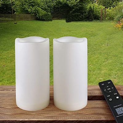 The Homemory 6” x 3” Outdoor Waterproof Flameless Candles are a perfect addition to your indoor or outdoor space. These flickering LED pillar candles are designed with a waterproof feature, making them more realistic and reliable without worrying about melting or rain. The candles have a 3D wick and a waterproof treatment on the top and base, simulating rainwater flowing from top to bottom. They come in an ivory plastic shell that becomes transparent when the light is on. With the convenient remote control, you can easily set timers or adjust the light modes and brightness. These battery-operated candles provide all the benefits of traditional candles without the negatives, such as no dripping-hot wax or smoke. Each set includes 2 outdoor candles, a remote control, and user manual. Enjoy the ambiance of these waterproof fake plastic candles with a customer rating of 4.6/5.