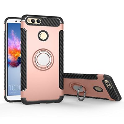 The Orzero TPU + PC Hybrid Dual Layer Case is a sleek and stylish protective case for Huawei Honor 7X and Huawei Mate SE. It is designed to provide full-body heavy-duty protection for your phone, with a 360° rotating metal ring that acts as a secure grip and a kickstand. The case is made of a dual layer of hard PC and TPU, offering superior shock absorption and scratch resistance. It also features a magnetic back cover, allowing for direct adsorption on a magnetic car bracket. The case has a lightweight design and a rose gold color that adds a special and fashionable touch to your phone. Please note that the Huawei Honor 7X is not included.