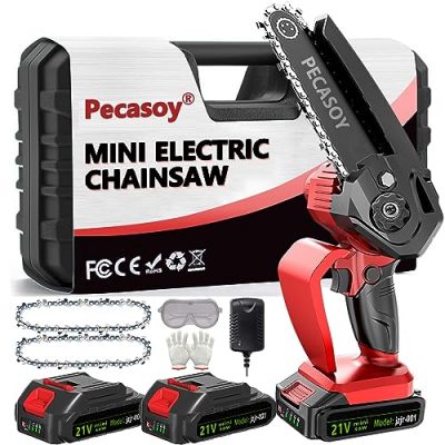 The Pecasoy mini chainsaw is a powerful and portable tool that is perfect for household and gardening applications. This cordless chainsaw features a German imported copper motor for fast and smooth cutting. It also offers overload protection and a battery operated design with a long-lasting rechargeable battery. The lightweight design makes it easy to use for extended periods without strain. The chainsaw comes with two batteries, two chains, a charger, tools, a hard carrying case, eye protector glasses, and protective gloves. With its compact size and efficient features, the Pecasoy mini chainsaw is a top choice for anyone in need of a reliable and convenient chainsaw.