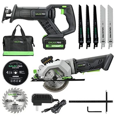 The GALAX PRO Circular Saw and Reciprocating Saw Combo Kit is a versatile and powerful set of tools perfect for various cutting tasks. The included circular saw has a 4.5-inch blade and a no-load speed of 3,400 RPM, making it ideal for cutting wood, metal, tile, drywall, plastic, and more. The reciprocating saw, powered by a 20V battery, delivers a no-load speed of 0 – 3200 SPM, providing strong and controlled cutting through wood, pipe, and metals. With adjustable speed and convenient safety features like a double protection switch and lock-on button, these tools offer both precision and protection. The kit also includes a 4.0Ah lithium battery, charger, 7 saw blades, and a tool bag for easy storage and transport.