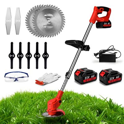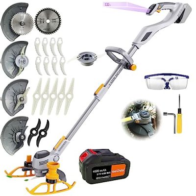 The Electric Weed Eater is a powerful and versatile 3-in-1 cordless grass trimmer, edger, and brush cutter. It comes with 4 different types of blades, making it perfect for tackling various gardening tasks. The 90° adjustable head and handle allow for easy maneuverability and customization to suit your cutting needs. With a long-lasting 21V 4.0A battery and a lightweight design, this weed wacker provides maximum safety and comfortable working. The package includes 2 battery packs, a power adapter, and a range of blades and accessories. Overall, this weed eater offers a convenient and efficient solution for maintaining your garden and yard.