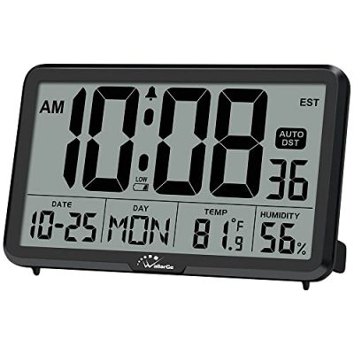The WallarGe 14.5'' Large Digital Wall Clock is a battery-operated clock with jumbo numbers, temperature, and date display. Its large high-definition LCD screen makes it easy to read the time, indoor temperature, and date from various angles. The clock is easy to set up and operates on 4xAA batteries, with a low battery indicator to ensure you never miss a battery replacement. The day and temperature display can be switched between different modes, and the clock can be wall-mounted or placed on a desk with its fold-out stand. It automatically adjusts for daylight saving time and offers two time display modes. With overwhelmingly positive reviews and a customer rating of 4.7 out of 5, the WallarGe Large Digital Wall Clock is a great addition to any room or office.