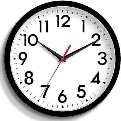The Bernhard Products Black Wall Clock is a silent, non-ticking 10-inch clock with easy-to-read black bold numbers against a white face background. Its precise quartz movement ensures accurate timekeeping. The clock features a sturdy plastic frame and a glass lens, making it easy to clean and keeping dust away from the dial. It is the perfect wall clock for offices, classrooms, bedrooms, bathrooms, shops, gyms, and any room in your home or business. The clock is lightweight and easy to hang, and it is powered by 1 "AA" battery (not included). It comes with a 12-month manufacturer warranty.