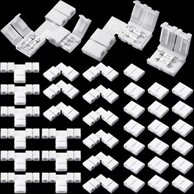 The 40 Pieces 2 Pin LED Strip Connectors Lights Connector T Shape L Shape Gapless Solderless Connectors LED Adapter Light Extension Connectors are a convenient solution for connecting and extending your LED strip lights. Made of quality PBT material, these connectors are durable and heat resistant. The package includes 10 L shape RGB connectors, 20 gapless 2 pin connectors, and 10 T shape LED adapters, providing you with sufficient quantity for your various needs. With a simple installation process, you can easily connect the LED strips without the need for additional tools. These connectors are suitable for 3528 2835 SMD RGB LED strip lights and have a maximum power of 72W. They are also suitable for DIY LED strips and can be applied to various areas such as kitchens and the back of TVs. However, it is important to remove the silicon around the solder wire before inserting the connectors to ensure proper functionality. Overall, these LED strip connectors are a convenient and reliable solution for extending and connecting your LED strip lights.