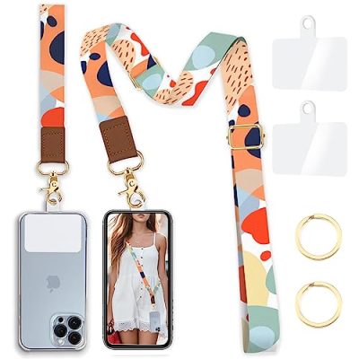 The Phone Lanyard Crossbody Wrist Strap is a cute and versatile accessory that allows you to keep your phone within sight while keeping your hands free. It includes an adjustable crossbody cellphone lanyard, a wrist strap, 2 phone tether tabs, and 2 key rings, all with abstract art design patterns. The lanyard can be customized to your preferred length and can be worn around your neck, wrist, or diagonally crossbody. Made with high-quality and soft polyester material, the lanyard is durable and won't interfere with using or charging your phone. It fits all sizes and models of mobile phones and is lightweight and easy to install. With a rating of 4.5/5, customers love its convenience and stylish design.