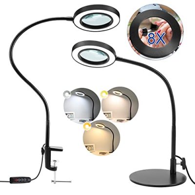 The 8X Magnifying Glass with Light and Stand is an essential tool for anyone who needs to focus on intricate details. With its 8X real glass lens, you can easily observe details without experiencing dizziness or eye strain. The bright LED light provides precise illumination while protecting your eyes, and the 3 color modes and stepless dimmable feature allow you to customize the lighting to your liking. The 2-in-1 design with a base and metal clip offers versatility and flexibility, making it perfect for various settings such as offices and bedrooms. This magnifying lamp is easy to install and move, and it comes with a USB power source. With its adjustable gooseneck and sturdy clamp, this magnifying glass with light is a great companion for reading, crafts, cross stitch, and other close work.