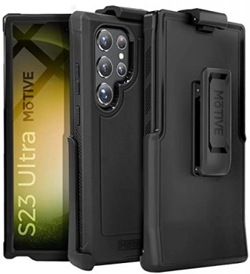 The MOTIVE for Samsung Galaxy S23 Ultra Heavy Duty Holster Case is the ultimate protective phone case for adventurous users. With its rugged quad-layer construction, this case offers 360-degree protection for your phone. It is designed for those who love outdoor sports or urban adventures and want to keep their phone safe. The case features raised bezels for camera protection, non-slip groove edges, tactile easy-press buttons, integrated port covers, and a reinforced holster. It meets military standards for shockproof protection and has been drop tested multiple times. The Made-To-Fit combo phone case includes an easy access belt clip that also functions as a kickstand. The MOTIVE case comes with a Limited Lifetime Warranty and excellent customer support.