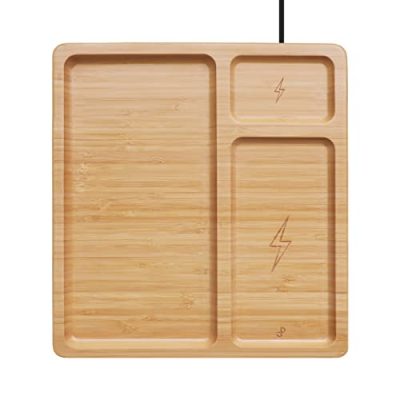 The PJ Collection Bamboo Valet Tray with Wireless Charging is the perfect organizer for your home office and bedroom nightstand. It features an elegant design made of bamboo, with two sections and raised edges to hold your jewelries, books, earphones, and other small items. The tray also doubles as a wireless charging station with a 15W charger at the center, compatible with all wireless charging phones and headphones. Safety is ensured with built-in overheat cut-off mechanisms and short circuit protection. Each bamboo tray is unique in pattern and grain, sourced from a small family-farm in Fujian Province, China. With an optimal charging distance, fast wireless charging is guaranteed. The PJ Collection Bamboo Valet Tray with Wireless Charging combines style, functionality, and convenience.