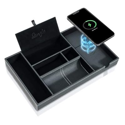 The SANZIE Leather Tray with Wireless Charger is the perfect nightstand organizer for keeping all your essentials in one place. With a built-in wireless charger, it conveniently charges compatible phones automatically. The tray features a 6 compartment layout, allowing you to neatly store your smartphone, wallet, keys, sunglasses, watches, jewelry, cash, coins, pens, and more. Made of durable and sturdy PU leather, this organizer ensures long-term use. It has a sleek and elegant design that can fit well in homes, offices, and hotels. The tray comes with a beautifully textured gift box, making it a perfect gift item. Please note that the charger and USB-C cable are not included.