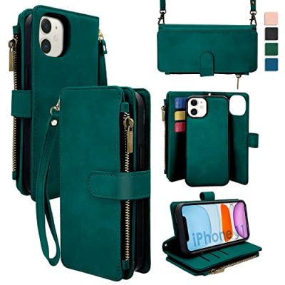 The jaminben iPhone 11 Phone Case Wallet is a stylish and functional accessory for your iPhone 11. Made from durable PU leather, it provides full protection for your phone while also offering plenty of storage with its 9 card slots, 1 cash slot, 1 zipper wallet, and 1 money slot. The detachable folio case allows you to switch between a wallet and a phone case effortlessly. With the built-in kickstand, you can enjoy hands-free video calls or entertainment. The case also comes with a convenient wrist/crossbody strap for when you want to keep your hands free. Compatible with iPhone 11 6.1-inch, this wallet case is a great gift for anyone. The case is available in green color and is designed with precise cutouts for easy access to all ports and buttons.