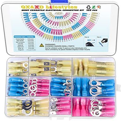 The 125PCS Heat Shrink Wire Connectors,Electrical Terminals Kit is perfect for marine, equipment, and automobile applications. It ensures a strong watertight seal and strong bonding. The kit includes red, blue, and yellow connectors that can be used on wire AWG from 22 to 10. The connectors are made of excellent material and quality with thick tinned copper barrels and high-quality Polyethylene insulating sleeves. They are easy to use, and different color-coded tubing with wire gauge imprint provides easy identification. The kit also includes female quick disconnect connectors, male quick disconnect connectors, and fork connectors. Overall, this kit offers performance, reliability, and a secure seal. It is compliant with industry standards, comes with a 30-day money-back guarantee and a 1-year warranty.