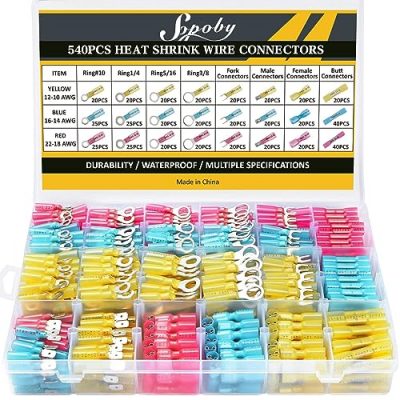 The Kuject 320 PCS Heat Shrink Wire Connectors is a versatile and reliable electrical wire terminals kit. With a proper ratio of various types, it meets commonly used needs such as ring, fork, spade, and heat shrink butt connectors. The premium copper core ensures good electrical conductivity and durability. The heat shrink crimp connectors provide a stronghold with greater pull strength. This kit is waterproof and the adhesive melted heat shrink tubing seals all the way to the end of the barrel, making it suitable for both indoor and outdoor use. The translucent adhesive-lined polyolefin tubing allows for straightforward visual inspection, prevents wire corrosion, and provides a waterproof seal. With its wide applications, this kit is perfect for automotive, motorcycle, and marine use. It is widely used for vehicle or ATV lighting, motorcycle stereo, boat electronics, and equipment switches.
