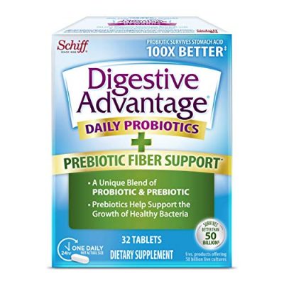 The Digestive Advantage Prebiotic Fiber + Probiotics is a daily probiotic that supports digestive and immune health. It combines prebiotic fiber with probiotics to promote the growth of healthy bacteria. It helps reduce minor abdominal discomfort and occasional bloating. The unique patented probiotic, BC30, survives stomach acid 100x better than leading probiotics and yogurts. The product is gluten-free and guaranteed for purity, freshness, and labeled potency. With a dimension of 2.63Lx3.50Wx4.50H and a size of 32 Count (Pack of 1), it is convenient and easy to use.