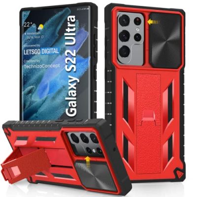 The Samsung Galaxy S22 Ultra Case is a rugged and protective phone cover designed for the S22 Ultra 5G phone. It features a slide camera lens cover to protect the camera from scratches and a built-in kickstand for hands-free viewing. The case offers military-grade drop protection and has an excellent grip with its textured design. It is compatible with wireless charging and is suitable for outdoor sports. The case comes in a vibrant red color. Overall, it is a durable and functional case that provides excellent protection for the Samsung Galaxy S22 Ultra.