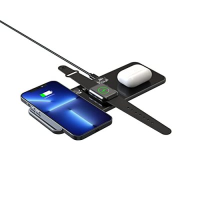 The Wireless Charging Station is an excellent choice for those needing to charge their iPhone, AirPods, and Apple Watch simultaneously. Its foldable design and strong magnetic connection make it convenient and reliable. The charger’s Qi-certification and multi-protection features guarantee a safe and efficient charging experience. While the phone may occasionally displace on the charging pad, this minor inconvenience is outweighed by the charger’s overall performance. The Wireless Charging Station is perfect for home use and travel, boasting a compact and portable design. With its stylish black color and attention to detail in construction, this 3-in-1 charger offers a high-quality charging solution.