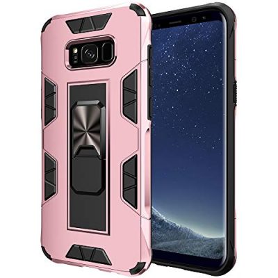 The Samsung Galaxy S8 Plus Case is a military-grade built-in kickstand case holder that offers heavy-duty shockproof cover protection for the Samsung Galaxy S8 Plus. It features a built-in hide kickstand for video calls or watching videos, a built-in metal magnetic sheet for convenient use with a magnetic car mount holder, and easy access to all buttons. The case is drop-proof, shockproof, and dust-proof, with four reinforced corners for strong protection. Its rose gold color adds a stylish touch to the phone. The case dimensions are 7.87Lx4.33Wx1.18H. Overall, it provides excellent protection for outdoor activities.