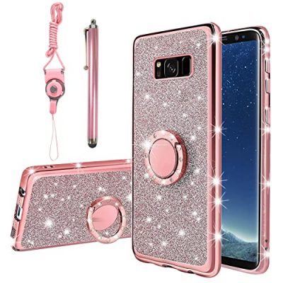 The KuDiNi for Samsung Galaxy S8 Case is a stylish and protective phone case designed specifically for the Samsung Galaxy S8. The case features a glitter rose design that adds a touch of luxury and bling to your phone. Made of high-quality electroplate shiny bumper with soft TPU Case, it provides excellent protection against shocks, drops, impacts, scratches, and dust. The case also includes a 360° ring kickstand that supports both rotation and folding, offering a comfortable grip and added protection. With precise cutouts, the case allows easy access to all the functions of your phone. The case is double-layered with an insert piece of glitter paper to keep it sparkley and smudge-free. Overall, it is a fashionable, protective, and convenient case for the Samsung Galaxy S8.
