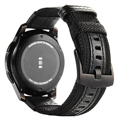 Personalize your Galaxy 46mm Watch with this Galaxy Watch 46mm/ Galaxy Watch 3 45mm/ Gear S3 woven nylon replacement strap. Made of high quality nylon fabric, it is durable and integrates with premium leather for a stylish look. The adjustable size design ensures a perfect fit, and the upscale black metal buckle adds a touch of sophistication. It comes with quick release pins for easy installation and removal. The band is compatible with Samsung Galaxy Watch 46mm, Galaxy Watch 3 45mm, Gear S3 Frontier, and other 22mm watches. However, it requires constant cleaning to prevent odor and isn't easily cleanable. Overall, it is a comfortable and rugged band for those who enjoy outdoor activities.
