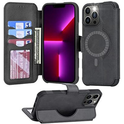 The Arae Compatible with iPhone 13 Pro Case Wallet is a stylish and functional accessory for your iPhone 13. Made of top-quality PU leather, this wallet case provides premium protection for your phone while also serving as a card holder. The built-in magnets allow for wireless charging without any speed interference, and the slim folio design minimizes bulk. With RFID blocking technology, you can keep your personal information safe. The case also features a kickstand for comfortable video calls or watching movies. Overall, this wallet case offers convenience, protection, and style for your iPhone 13 Pro.