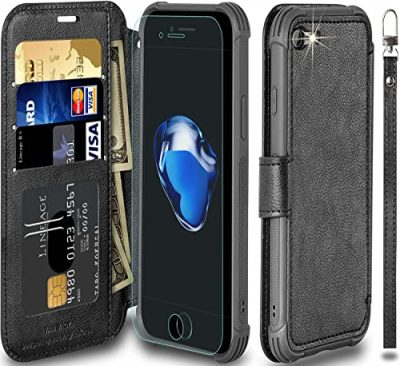 The VANAVAGY Wallet Case is a classic and luxurious flip leather cover designed for iPhone SE 2022(5G)/iPhone SE 2020/iPhone 8/iPhone 7. It features a thoughtful design with precise cutouts for easy access to speakers, cameras, and buttons. The case comes with a wrist strap for added convenience and portability. With RFID blocking technology, it protects your personal information from theft. The case also includes three card slots and a side pocket for storing credit cards, cash, and photos. The premium vegan leather is durable and prevents screen scratches. The case is shockproof and anti-slip, with a strong magnetic closure for added security. It supports wireless charging without the need to remove the case. As an ideal gift, it comes with an exquisite packaging box and an additional glass screen protector. The VANAVAGY Wallet Case offers a 60-day money-back guarantee.