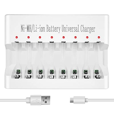 The EBL Smart 8 Bay AA AAA Battery Charger is a convenient and easy-to-use household battery charger that can charge all brands of Ni-MH and Ni-CD rechargeable batteries. It is equipped with 2 USB ports for charging smartphones or other USB devices. The charger has intelligent features such as automatic stop charging when detecting improper input voltage or non-rechargeable batteries. It also has advanced safety functions like over-heat and over-current protection. The LED light displays the charging status of the batteries. The charger comes in a sleek white color and has compact dimensions. With a customer rating of 4.5/5, it has received positive reviews for its great customer service, fast charging, and value for money.